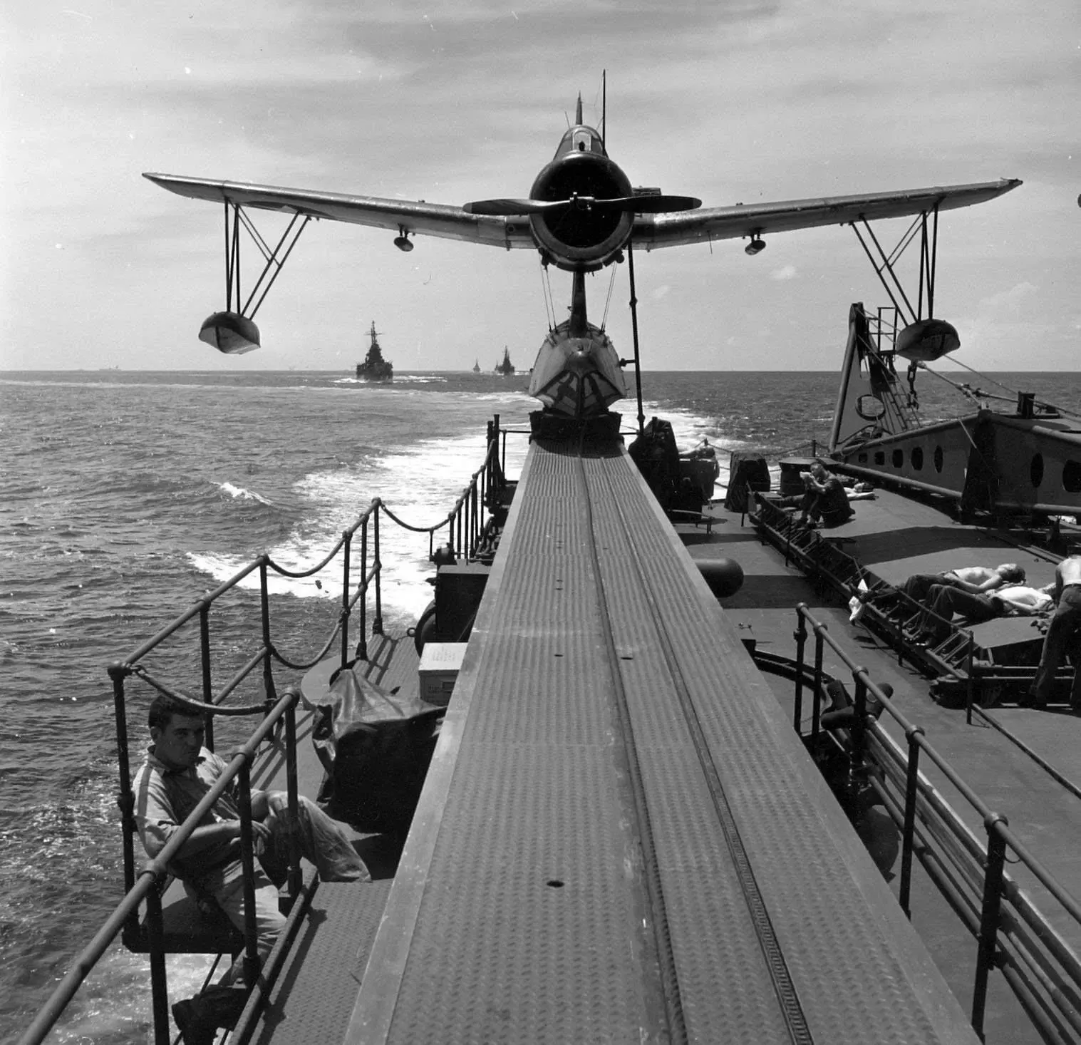 Steaming as before on course 189 degrees (T & pgc) 176 degrees (psc) at 15 knots. 1332 C/C to 340 degrees (T & pgc). 1334 C/S to 20 knots. 1339 Catapulted plane No. 35785 for training; Ensign R.B. JOHNSTONE, USN, Pilot. 1340 C/S to 15 knots; C/C to 189 degrees (T & pgc) 176 degrees (psc)