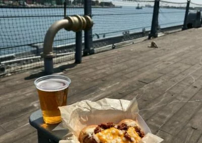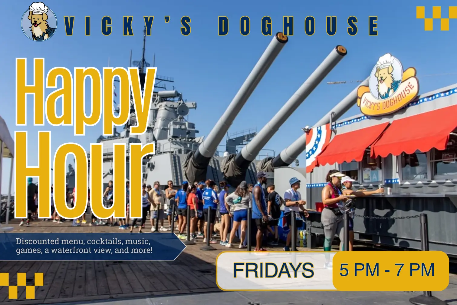 Vicky’s Doghouse is a gourmet hotdog kitchen on the fantail of the Battleship IOWA serving a variety of hotdogs, sides, salads, beers and wines. It is named for the ship’s famous mascot from the 1940s – a mischievous little dog that belonged to the ship’s first captain. Look for Vicky as a feature in a popular scavenger hunt for kids aboard the ship as well.