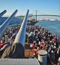 Battleship IOWA is located on the LA Waterfront at the Port of Los Angeles, the Western Hemisphere’s busiest port complex. Moored against the backdrop of the Vincent Thomas Bridge, the ship offers stunning views of the main channel and ships passing throughout the day.