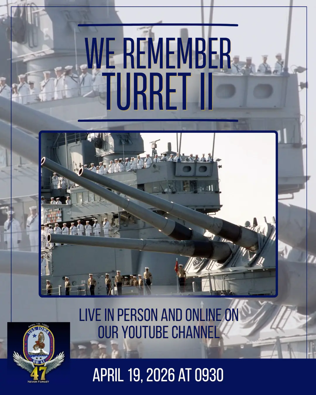 – We will be commemorating the 37th anniversary of the April 19th Turret 2 explosion on the fantail. Please join us for a short ceremony to honor all those who made the ultimate sacrifice that day.
