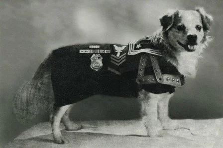 After returning the President home, the IOWA proceeded to the Pacific theatre of war. via the Panama Canal, clearing it by one foot on each side and steamed across the Pacific Ocean. The Iowa participated in numerous bombardments of Japanese held islands, sank a Japanese Cruiser, shot down several planes and was awarded 9 battle ribbons. On 25 June 1945, Vicky was award the Philippine Campaign Ribbon with two bronze stars and on 27 August 1945 received a commendation as a member of Task Force 31 and the Occupation of the Japanese Homeland. This entry also noted that Vicky was the “first American Dog on Japanese Empire soil (to the best of our knowledge).”